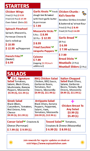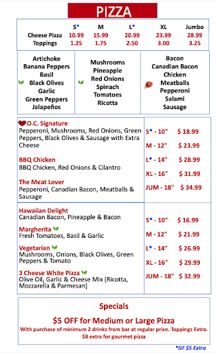 At OC Pizza, the menu is a delightful journey for any pizza lover, offering a wide range of mouthwatering dishes designed to satisfy every craving. For starters, indulge in their Jumbo Wings or crispy Garlic Knots, perfect for snacking while waiting for your main course. If you’re in the mood for something lighter, the Spinach Pinwheels, with or without pepperoni, are a deliciously savory choice, as are the classic Garlic Bread and the fresh, zesty Antipasto Salad.