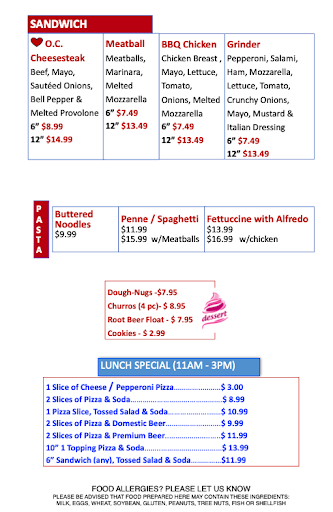 If you're craving something other than pizza, their Sandwiches won’t disappoint. The OC Cheesesteak is a crowd favorite, as well as the flavorful BBQ Chicken Sandwich and the satisfying Meatball Sandwich. If you prefer pasta, their Fettuccine with Alfredo and Penne with Meatballs are classic choices, while the Spaghetti with Marinara offers a traditional taste of Italy.